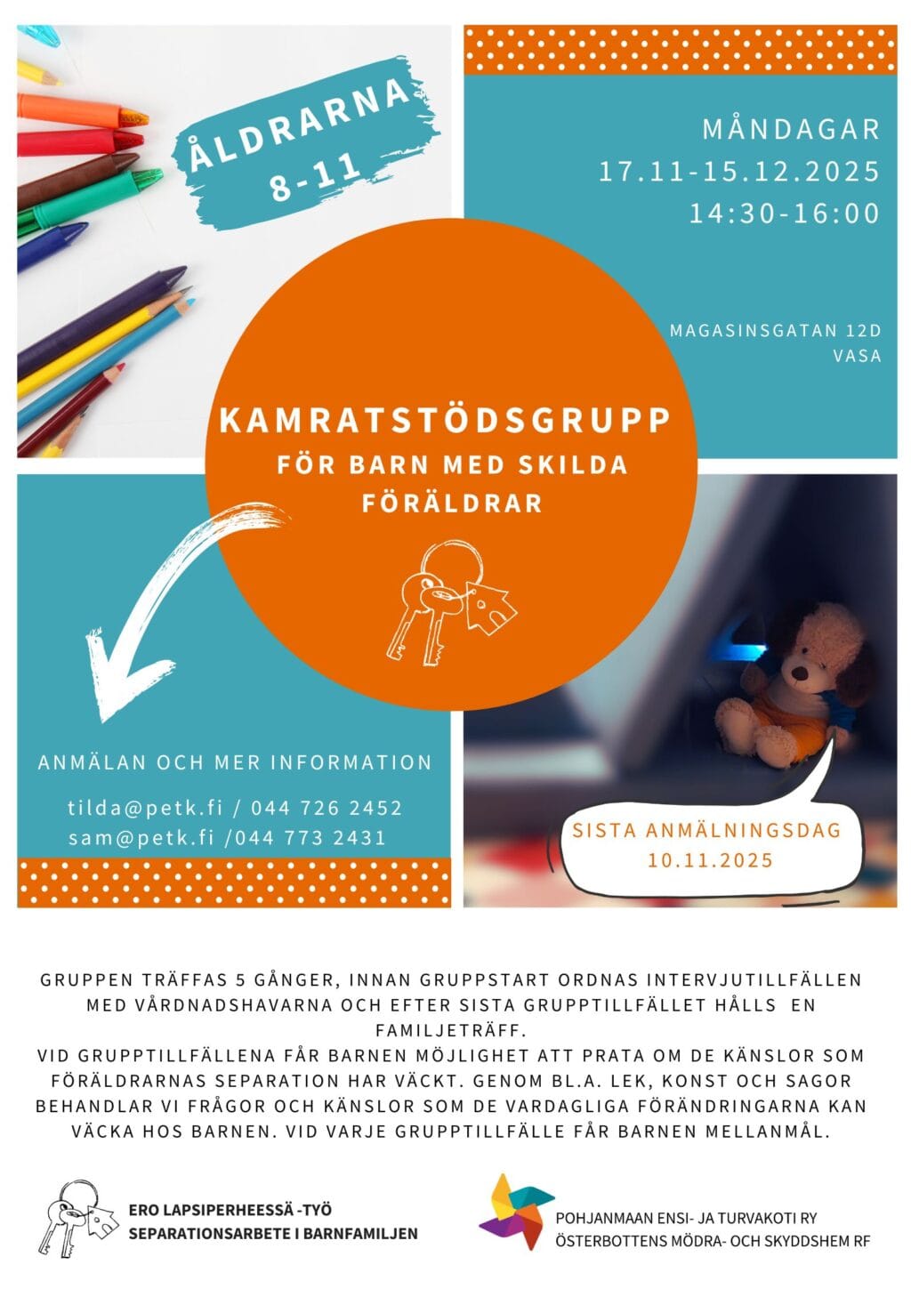 VID GRUPPTILLFÄLLENA FÅR BARNEN MÖJLIGHET ATT PRATA OM DE KÄNSLOR SOM FÖRÄLDRARNAS SEPARATION HAR VÄCKT. GENOM BL.A. LEK, KONST OCH SAGOR BEHANDLAR VI FRÅGOR OCH KÄNSLOR SOM DE VARDAGLIGA FÖRÄNDRINGARNA KAN VÄCKA HOS BARNEN. VID VARJE GRUPPTILLFÄLLE FÅR BARNEN MELLANMÅL.